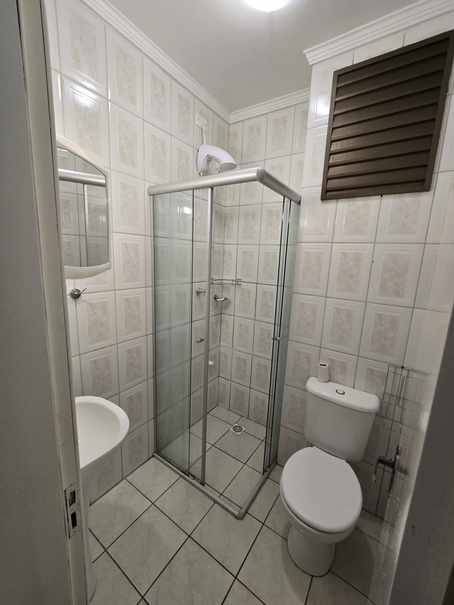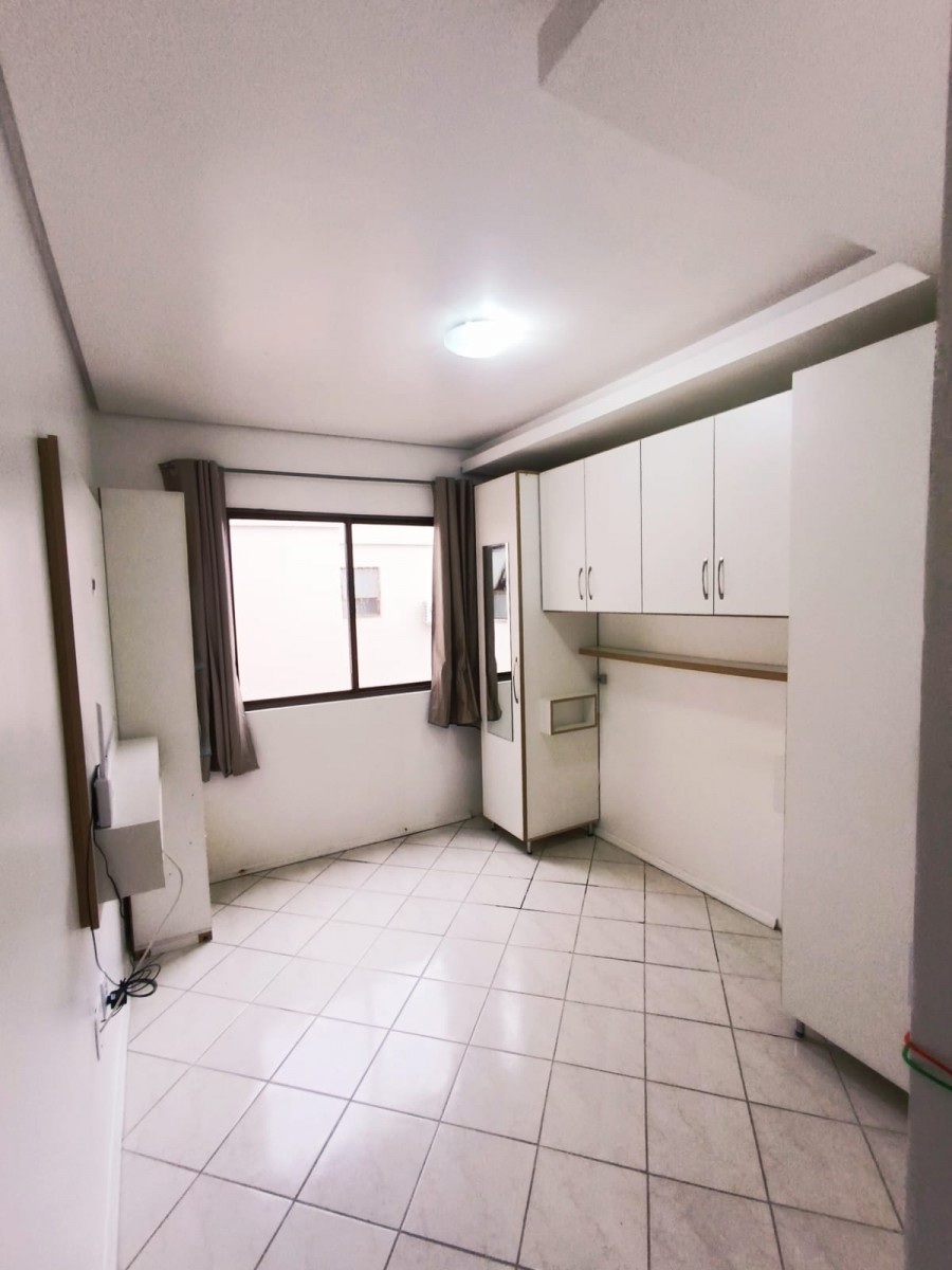 Kitnet semi mobiliado com um dormitório, banheiro social, cozinha e área de serviço integradas e uma vaga de garagem.