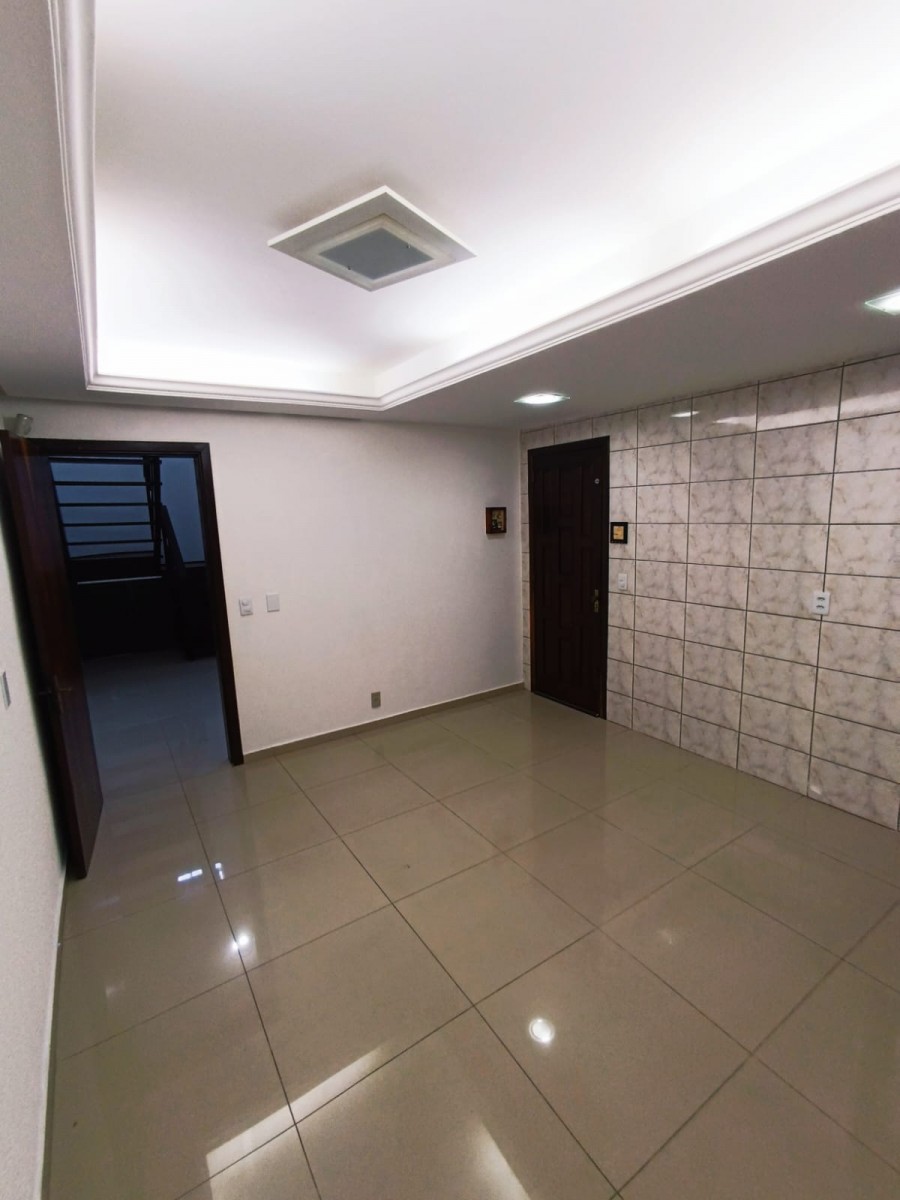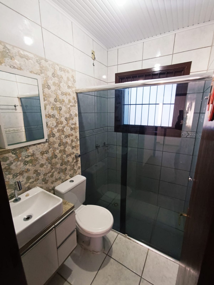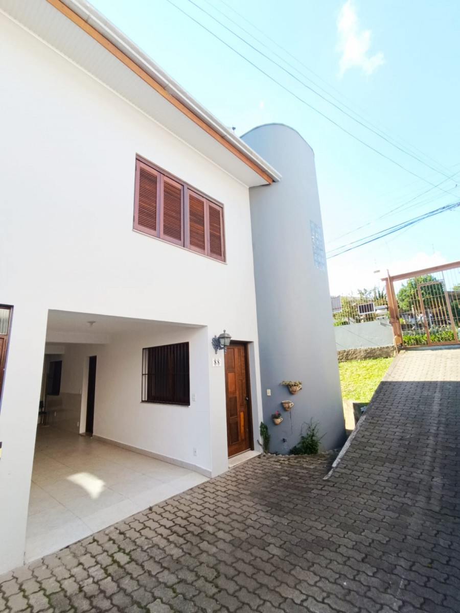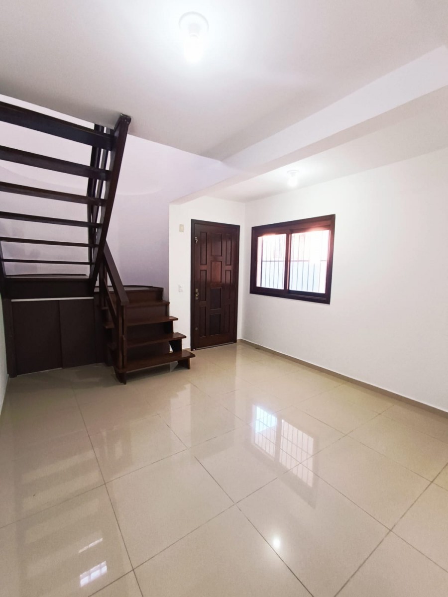 Sobrado duplex com três dormitórios, banheiro social, sala de estar e jantar integradas, cozinha, área de serviço com churrasqueira e garagem coberta para dois carros.
